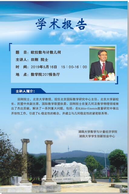 田刚院士,北京大学教授,现任北京国际数学研究中心主任、北京大学副董事长、民盟中央副主席,国际数学联盟执委。田刚院士在复几何及数学物理领域做出了杰出贡献,解决了一系列重大问题,包括:在Kähler-Einstein度量研究中做出开创性工作,引进了K-稳定性的概念,并建立与几何稳定性的紧密联系等。