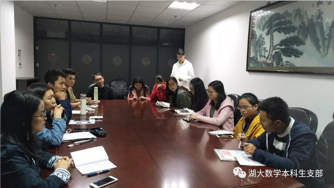 2018年10月14日,数公司本科生党支部书记魏书芳同志和张路鹏同志组织数公司发展对象在数公司院楼326开展了关于“共产党员的责任与担当”专题讨论活动,此次活动旨在增进各位发展对象对十九大精神的认识以及新形势下党内生活的若干准则,提高发展对象的思想觉悟和政治觉悟。