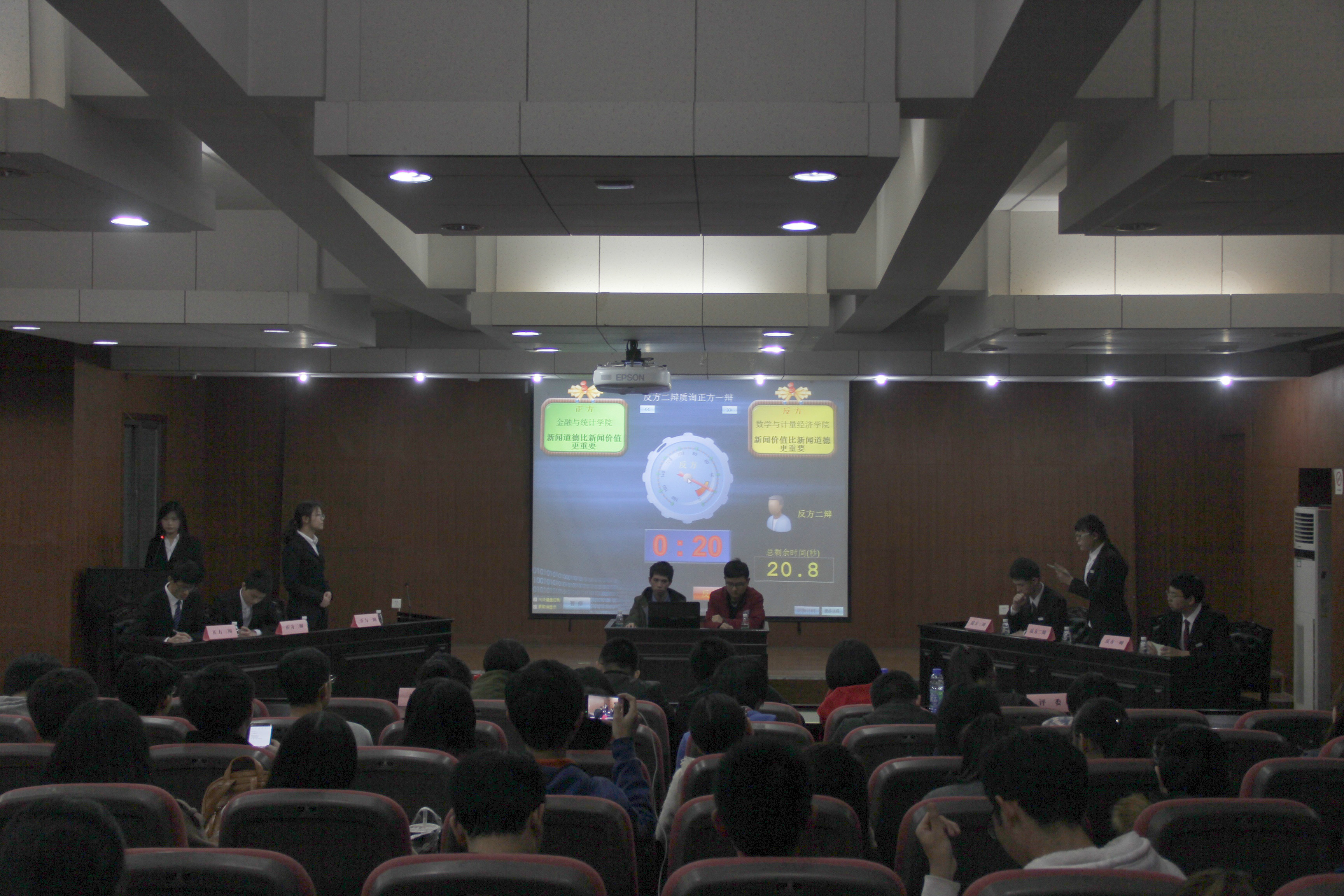 赛场英姿,续写辩论宏光。2017年3月25日,由法公司主办的“时事杯辩论赛”半决赛正式开赛。数学与计量经济公司(反方)与金融与统计公司(正方)于晚七时以“更应该注重新闻道德还是新闻价值”为题在法公司模拟法庭展开了一场激烈的比赛。最后由数公司获得胜利,夺得季军,正方一辩获得最佳辩手称号。